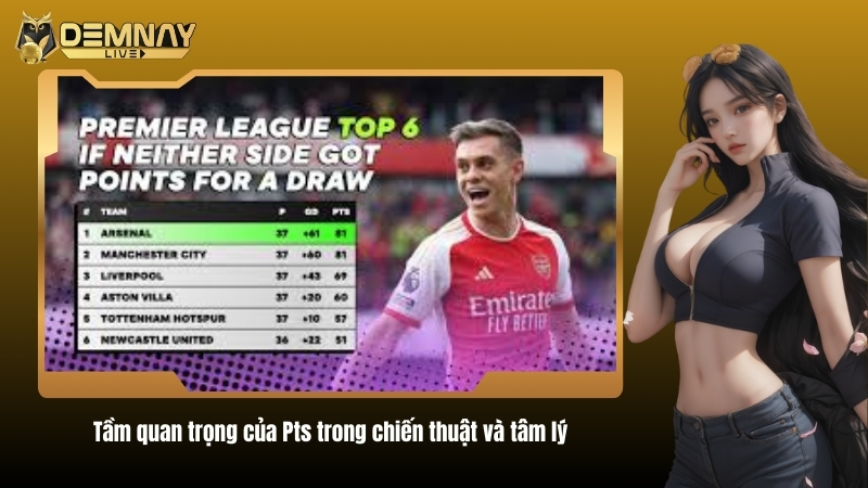 Pts còn đóng vai trò quan trọng trong chiến thuật và tâm lý thi đấu. Một đội dẫn đầu Pts có thể triển khai chiến thuật tự tin, thử nghiệm cầu thủ trẻ hoặc chiến thuật mới. Cầu thủ cũng được khích lệ tinh thần khi đội bóng có Pts cao, đồng thời tạo áp lực lên các đối thủ cạnh tranh. Việc cập nhật Pts trực tuyến qua các nền tảng như Demnaylive giúp người hâm mộ theo dõi diễn biến, dự đoán thứ hạng và phân tích chiến thuật chính xác.